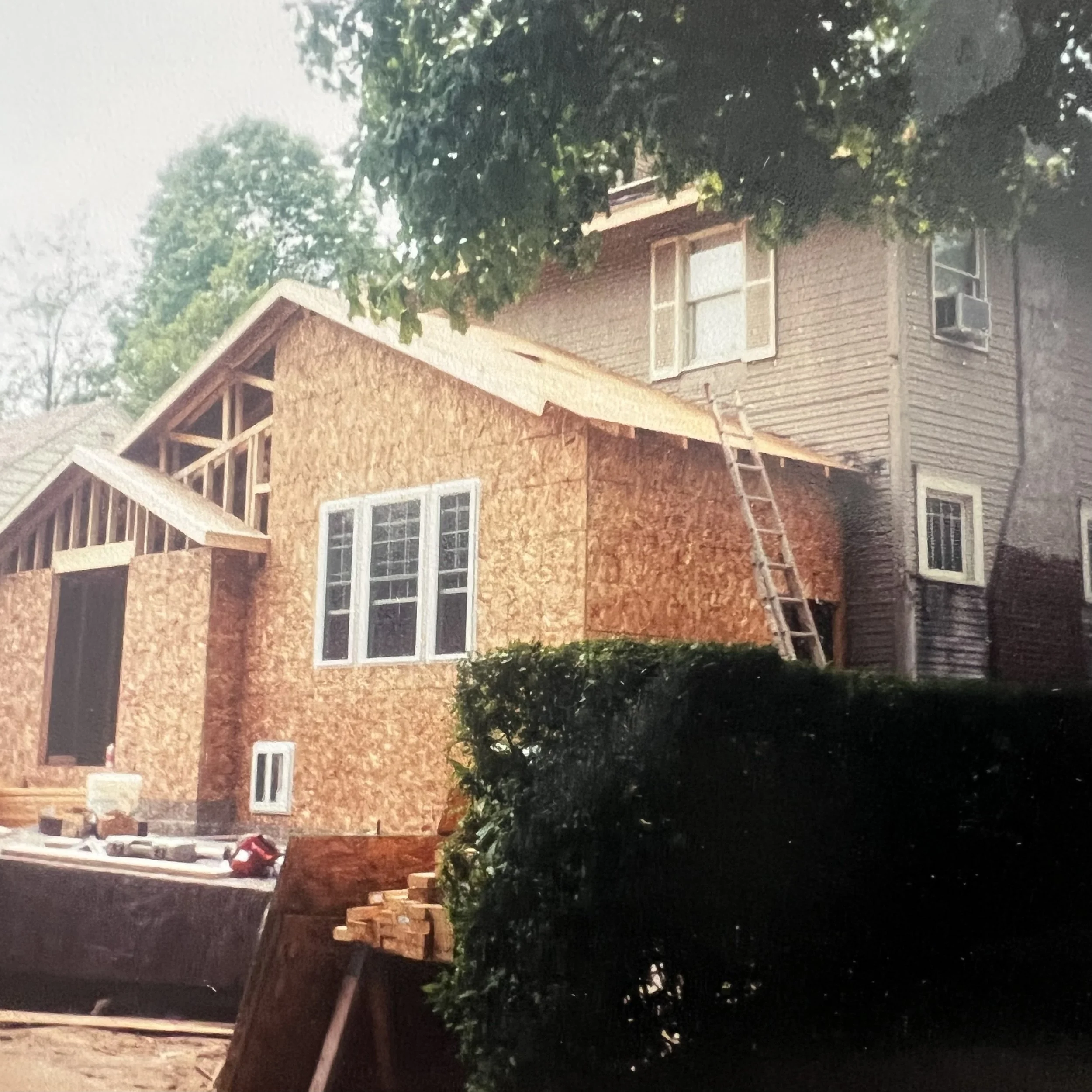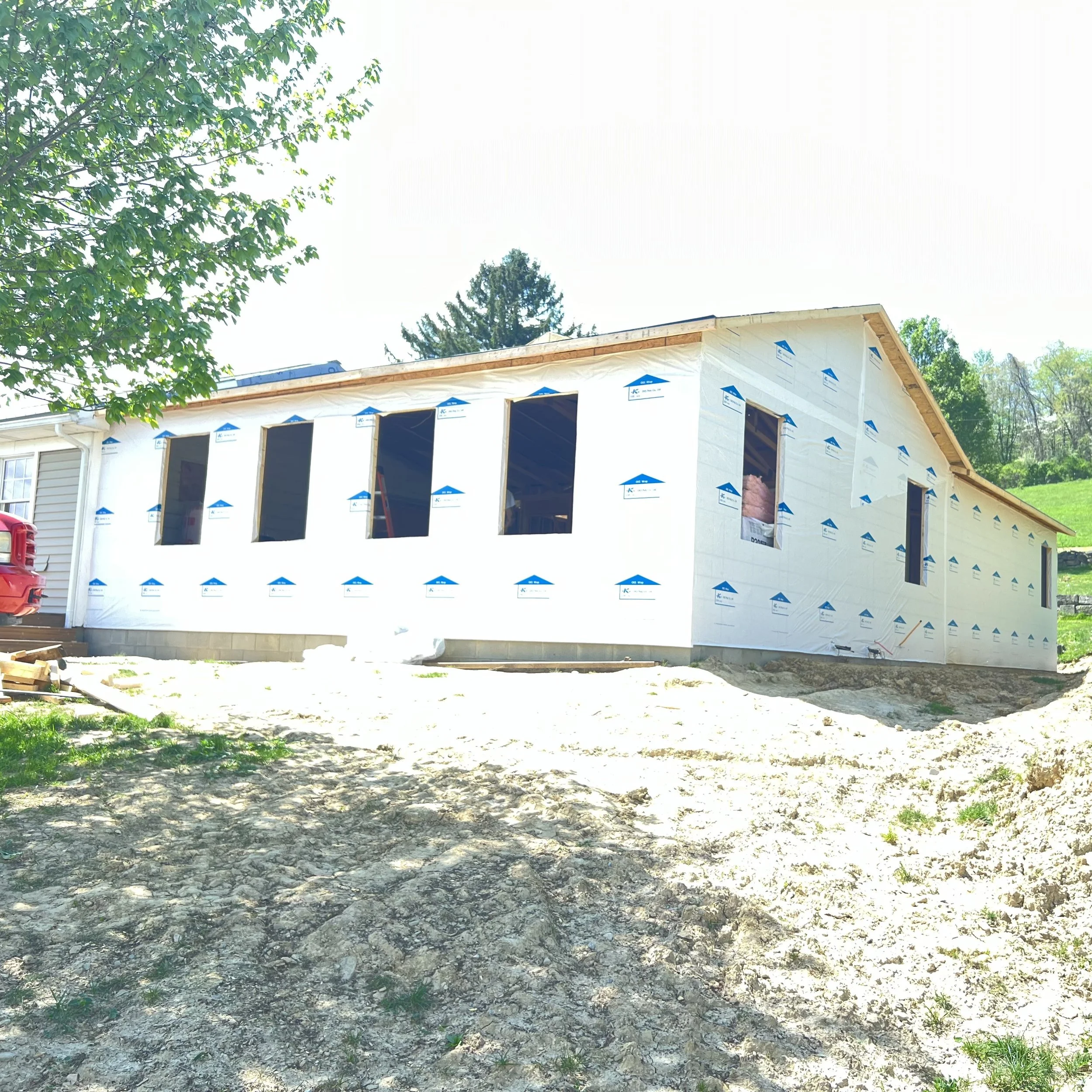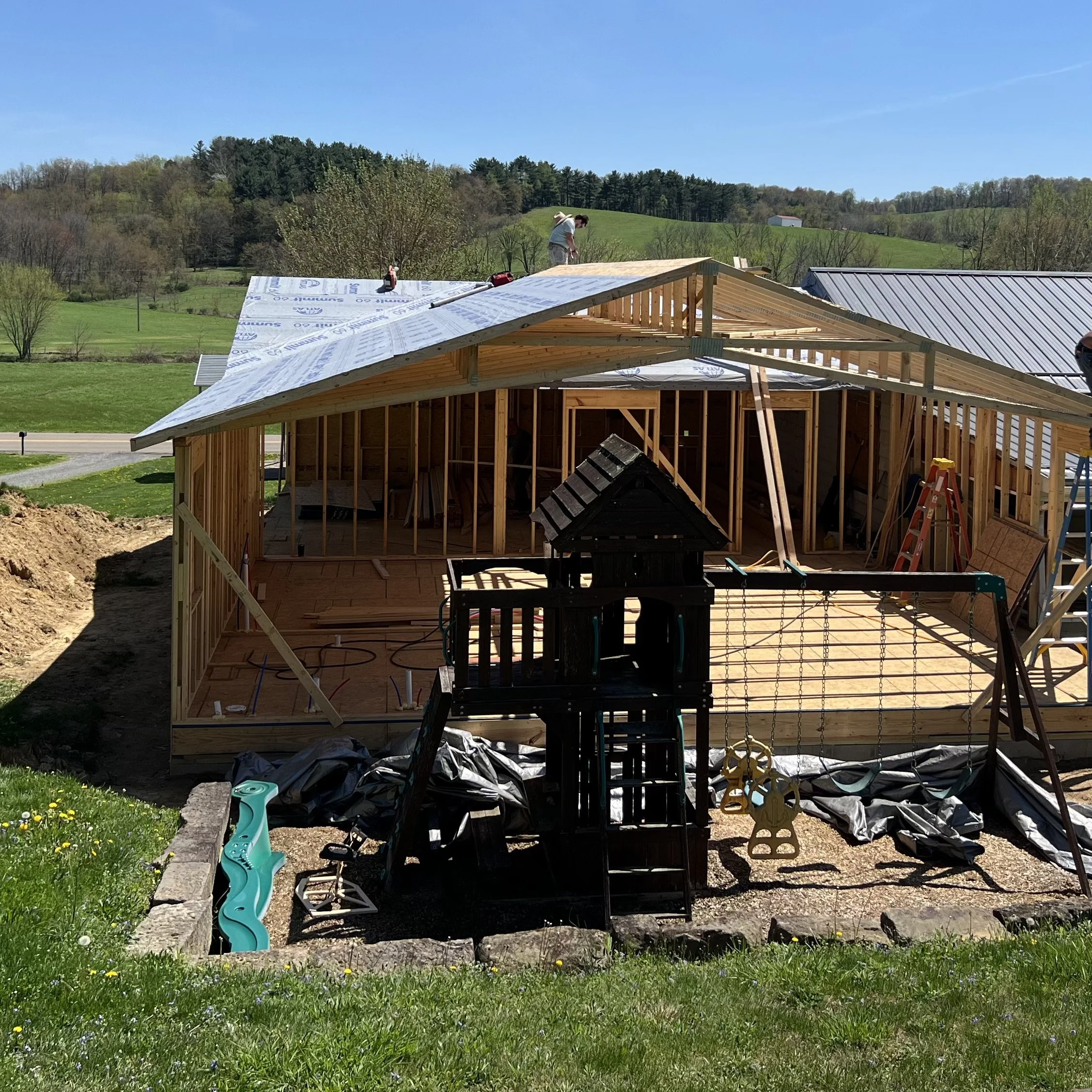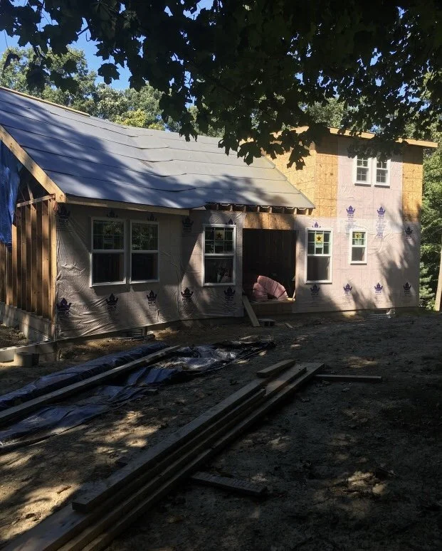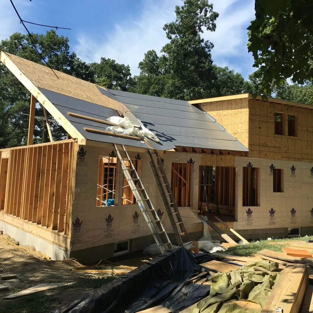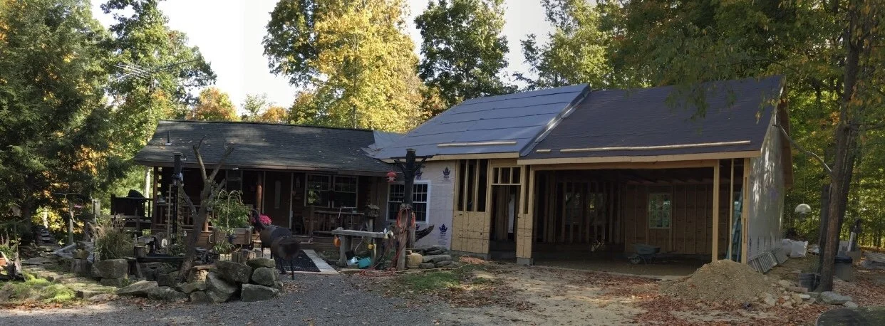 Roof Sheathed & Roofing Underlayment Installed, Tied into Existing House (Front View)