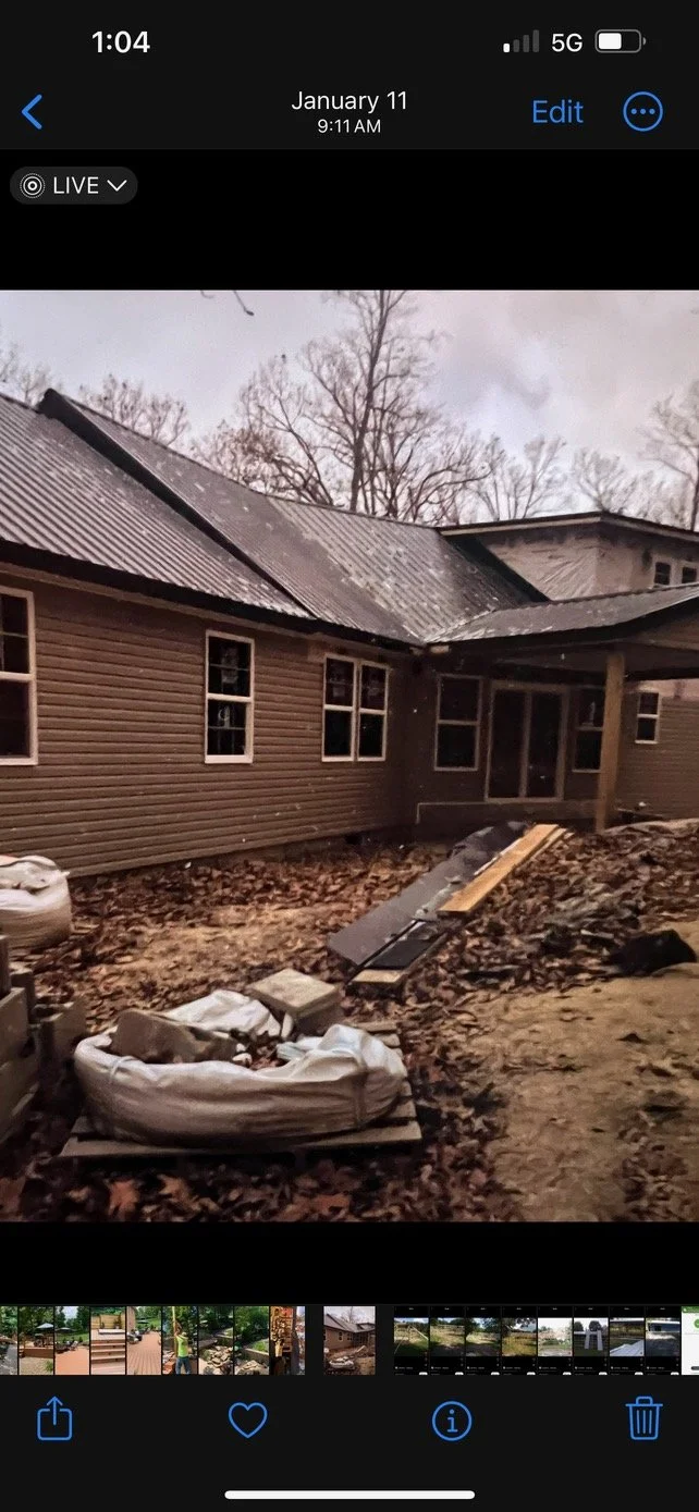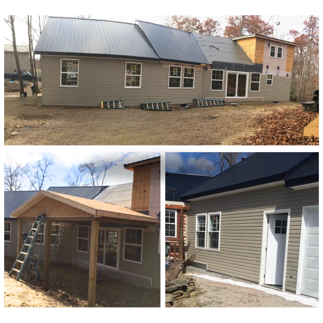 (Top) Metal Roof Installed, Vinyl Siding Being Installed, (Bottom Left) Back Porch Framing, (Bottom Right) Front View Metal Roof Complete Vinyl Siding Complete