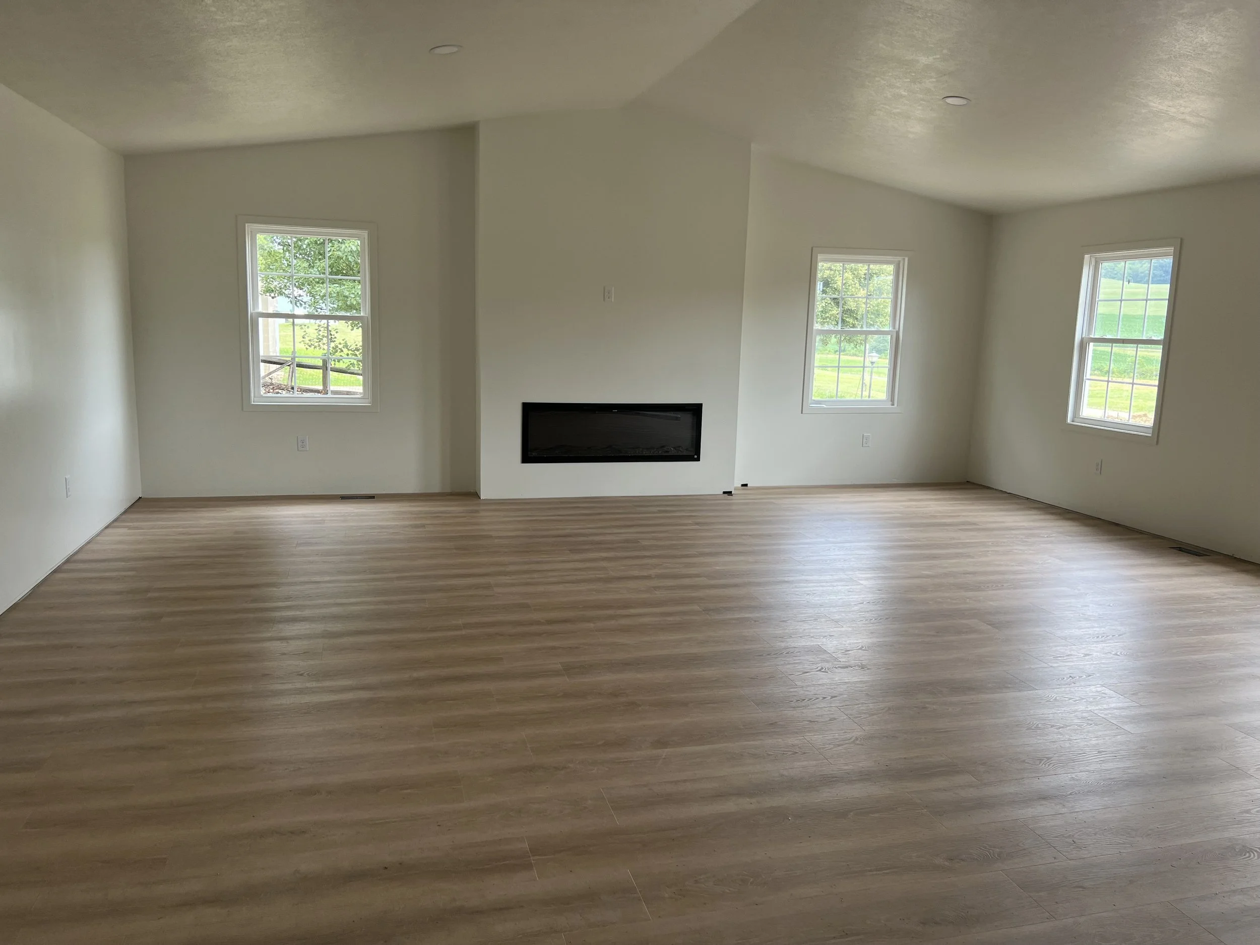 Finished Interior - Living Room - Drywall Painted, Flooring Installed, and Recessed Fireplace Installed