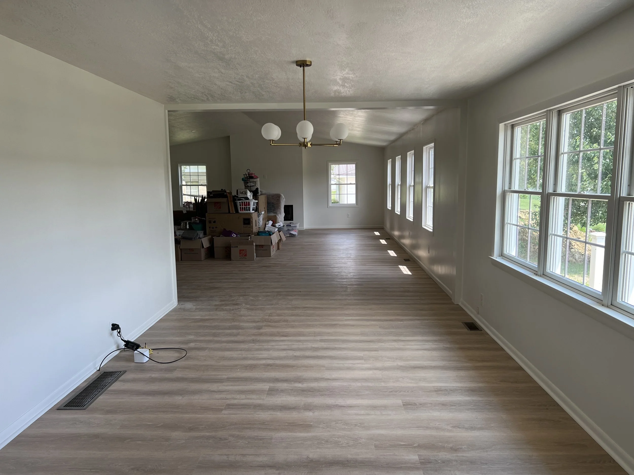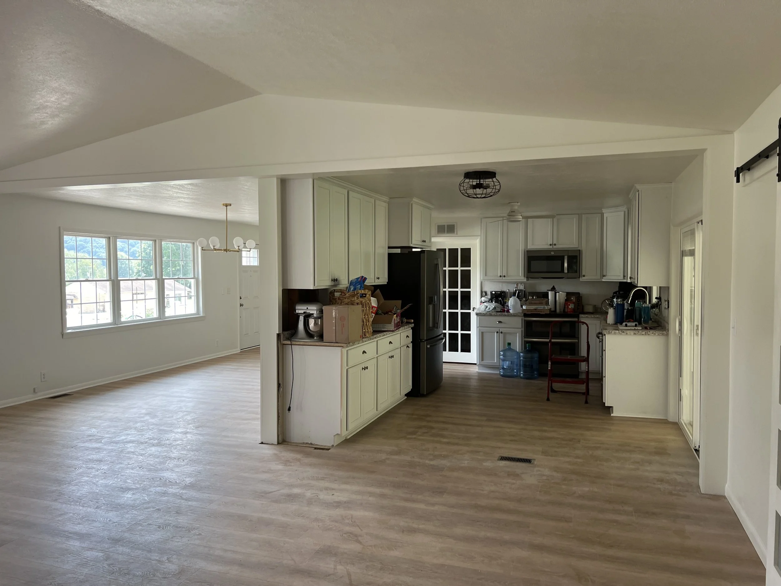 Wall Removed to Connect New Living Room to Dining Room and Kitchen of Old House